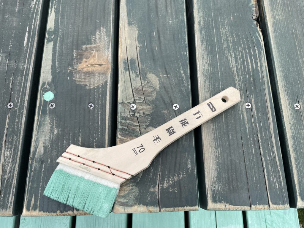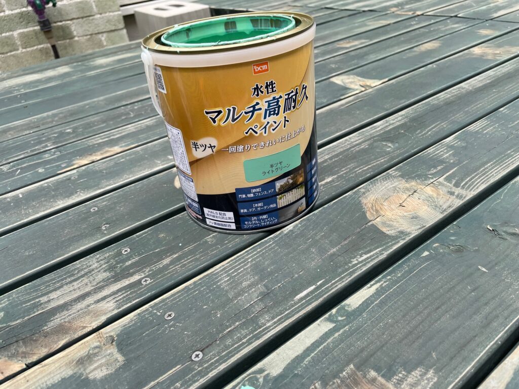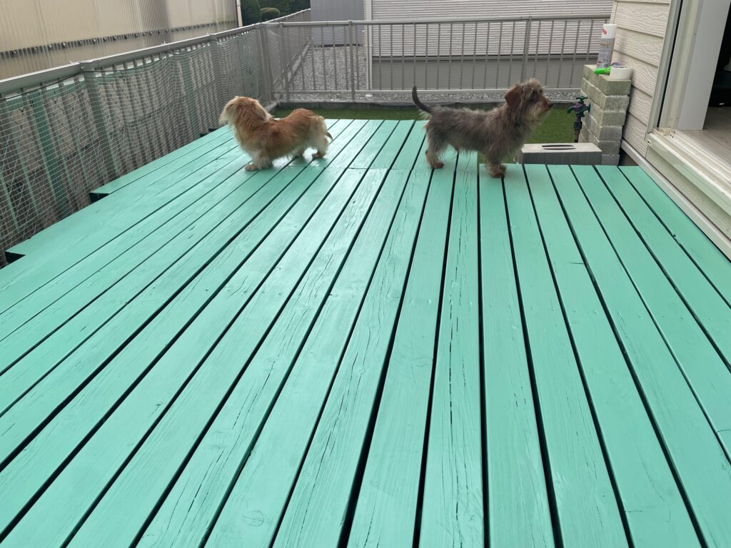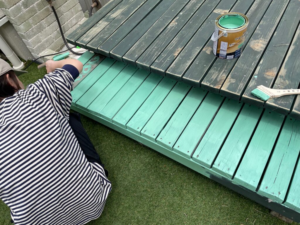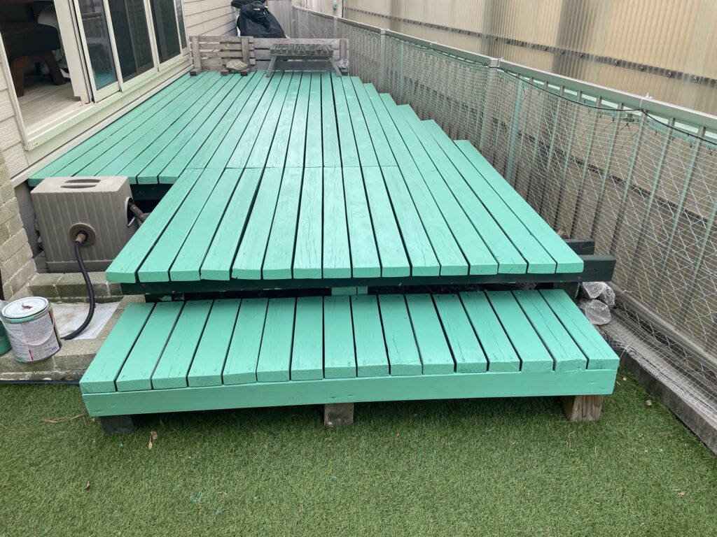 ウッドデッキの表面がささくれて、ペンキも剥がれてきてたので耐久性も安全性もダメそうだったからメンテナンス、ついでに色も変えてイメチェン